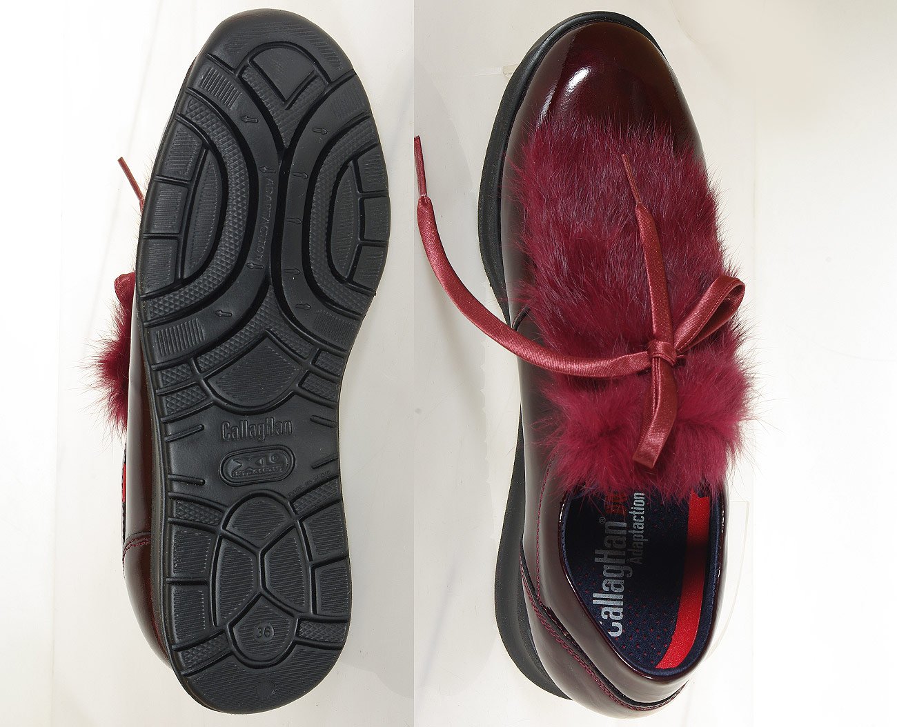Damskie półbuty CallagHan Diaval w bordowo-czerwonym odcieniu zachwycają eleganckim lakierowanym wykończeniem. Skórzana cholewka i wnętrze zapewniają komfort, a technologia Adaptaction dostosowuje się do stopy. Lekkie i stylowe, wykonane w Hiszpanii.