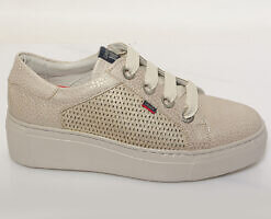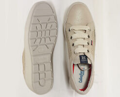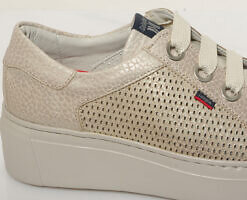 W 100% wyprodukowane w Hiszpanii superlekkie, przewiewne sneakersy damskie marki CallagHan z cholewką z naturalnej, ażurowej skóry w kolorze beżowo-złotym. Niezwykle komfortowe dzięki unikatowej technologii adaptaction, która dostosowuje szerokość buta do stopy podczas chodzenia. kod: 14919