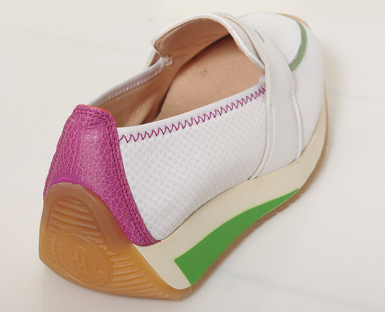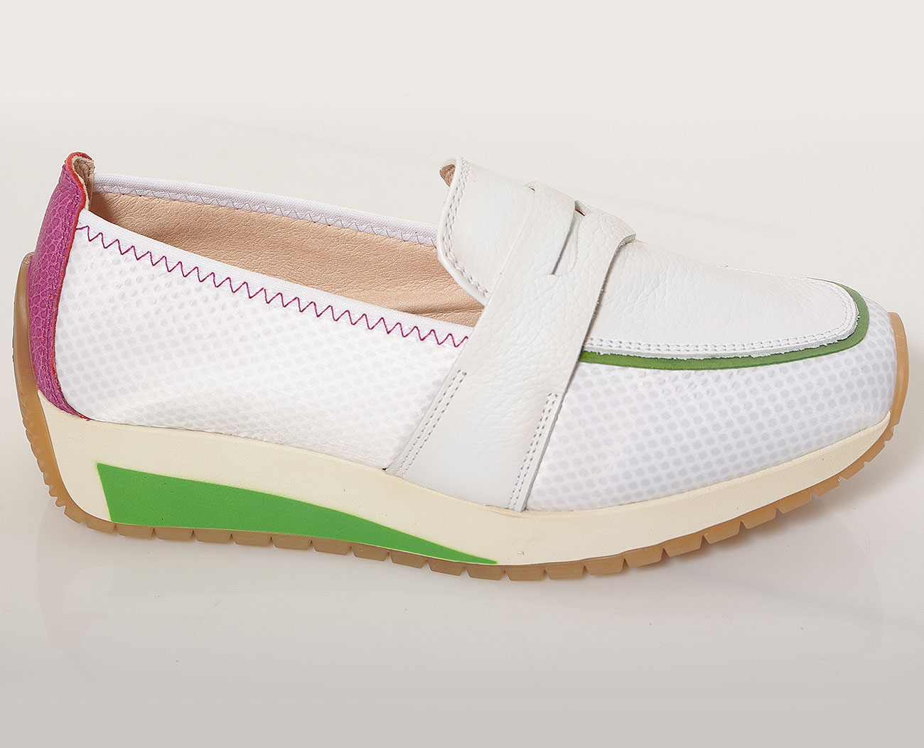 Modowy hit – damski mokasyn na sneakersowej, sportowej podeszwie hiszpańskiej marki Hispanitas w klasycznej bieli z kolorowymi dodatkami. Kobiece, oryginalne i jednocześnie komfortowe. Cholewka ze skóry połączonej z tekstylną, przewiewną siatką mesh pozwala stopie oddychać. Kod produktu: CHV221726