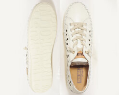 Damskie sneakersy Pikolinos Soller W8B-6550 w odcieniach beżu i bieli to stylowe, wsuwane buty z elastycznymi gumkami zamiast klasycznego sznurowania. Wykonane z wysokiej jakości skóry, z miękką, skórzaną wkładką i amortyzującą podeszwą z gumy. Komfortowe, lekkie i wyposażone w wyjmowane wkładki.