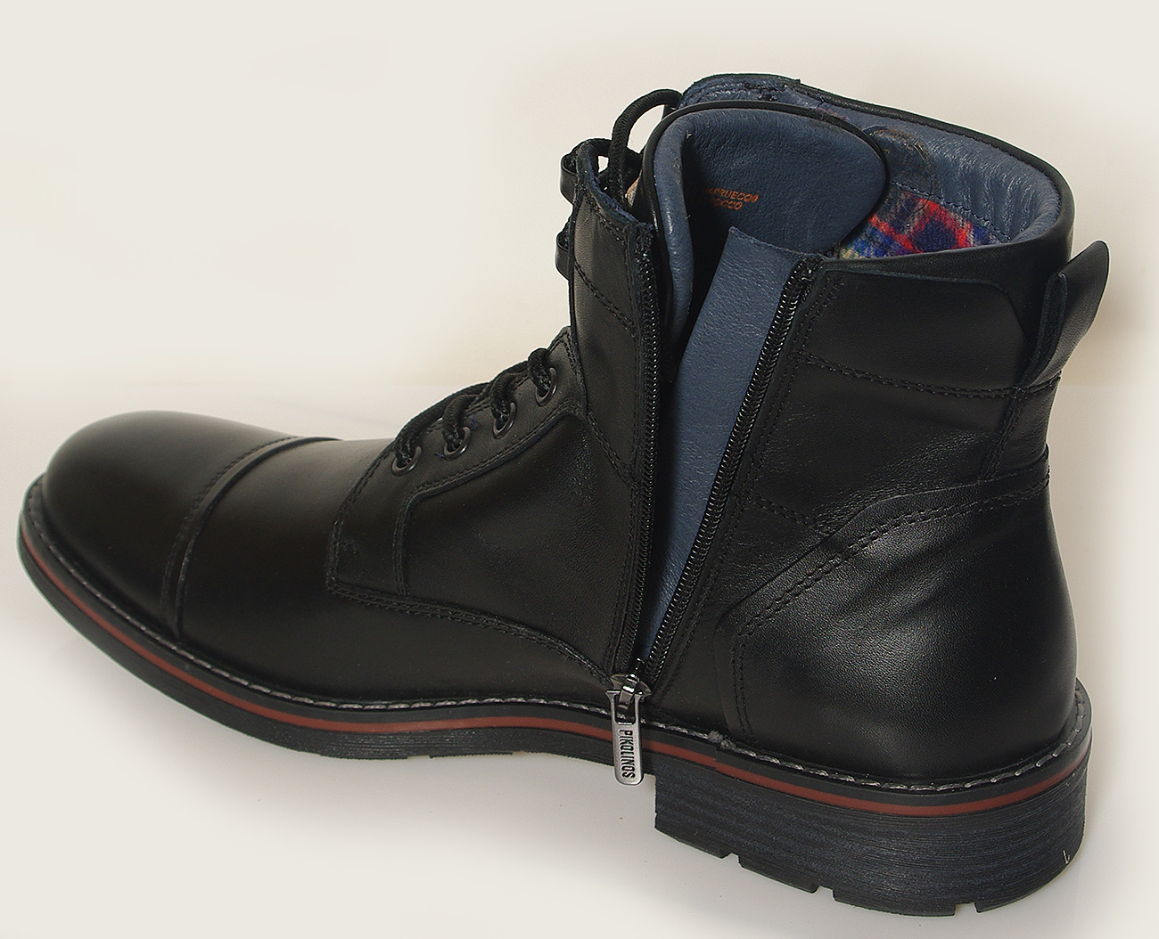 Męskie trzewiki Pikolinos YORK (M2M-8156) w czarnym kolorze, wykonane ze skóry. Łączą praktyczne sznurowadła z suwakiem dla wygody użytkowania. Skórzano-tekstylne wnętrze, wyjmowana i amortyzowana wkładka oraz elastyczna podeszwa gwarantują komfort noszenia. Stylowy model Made in Spain.