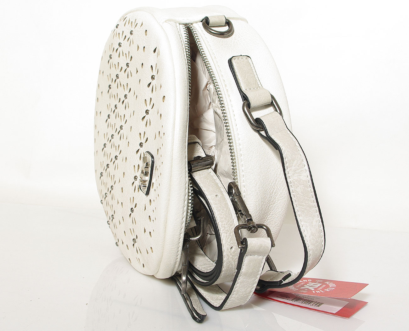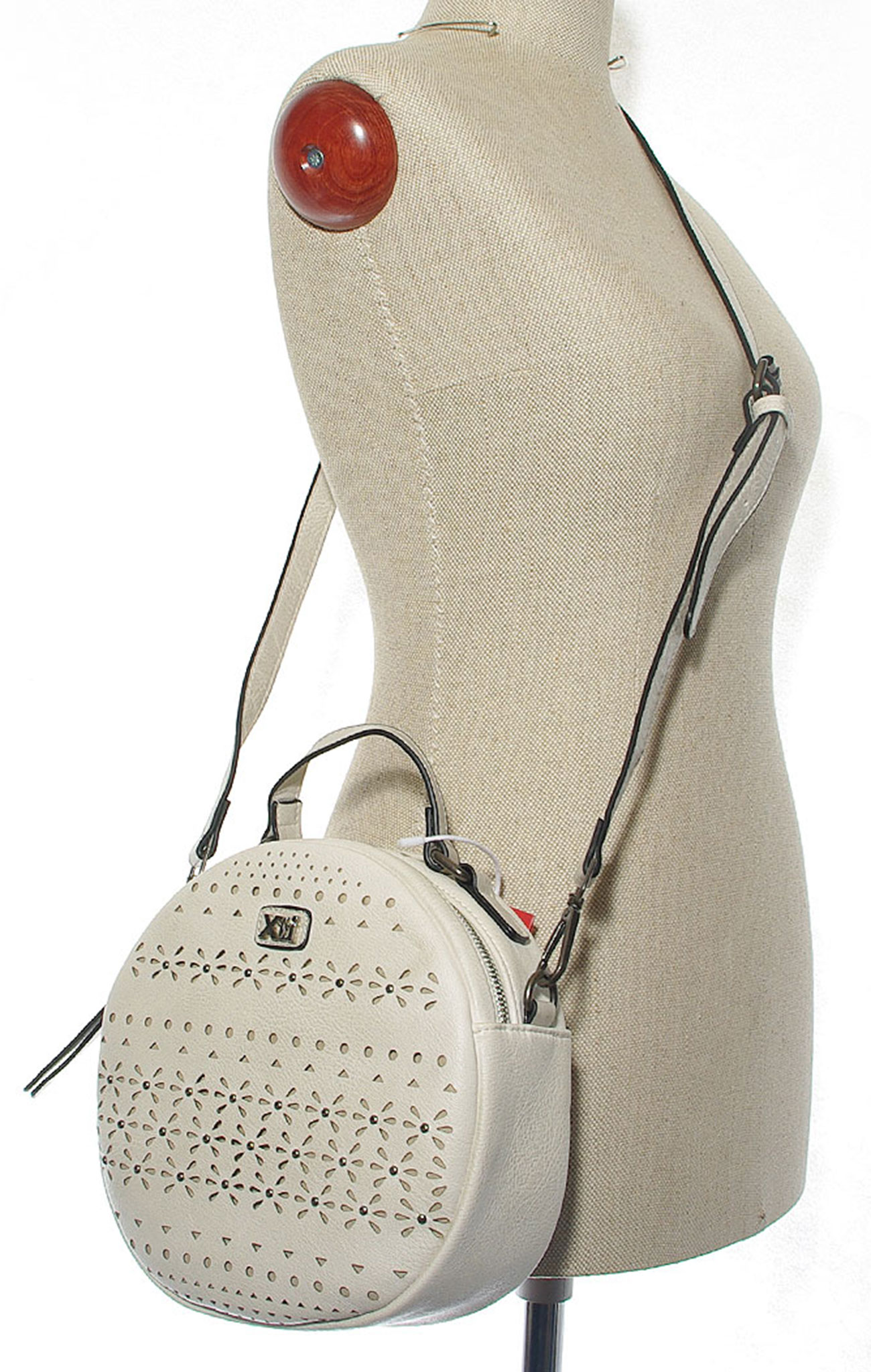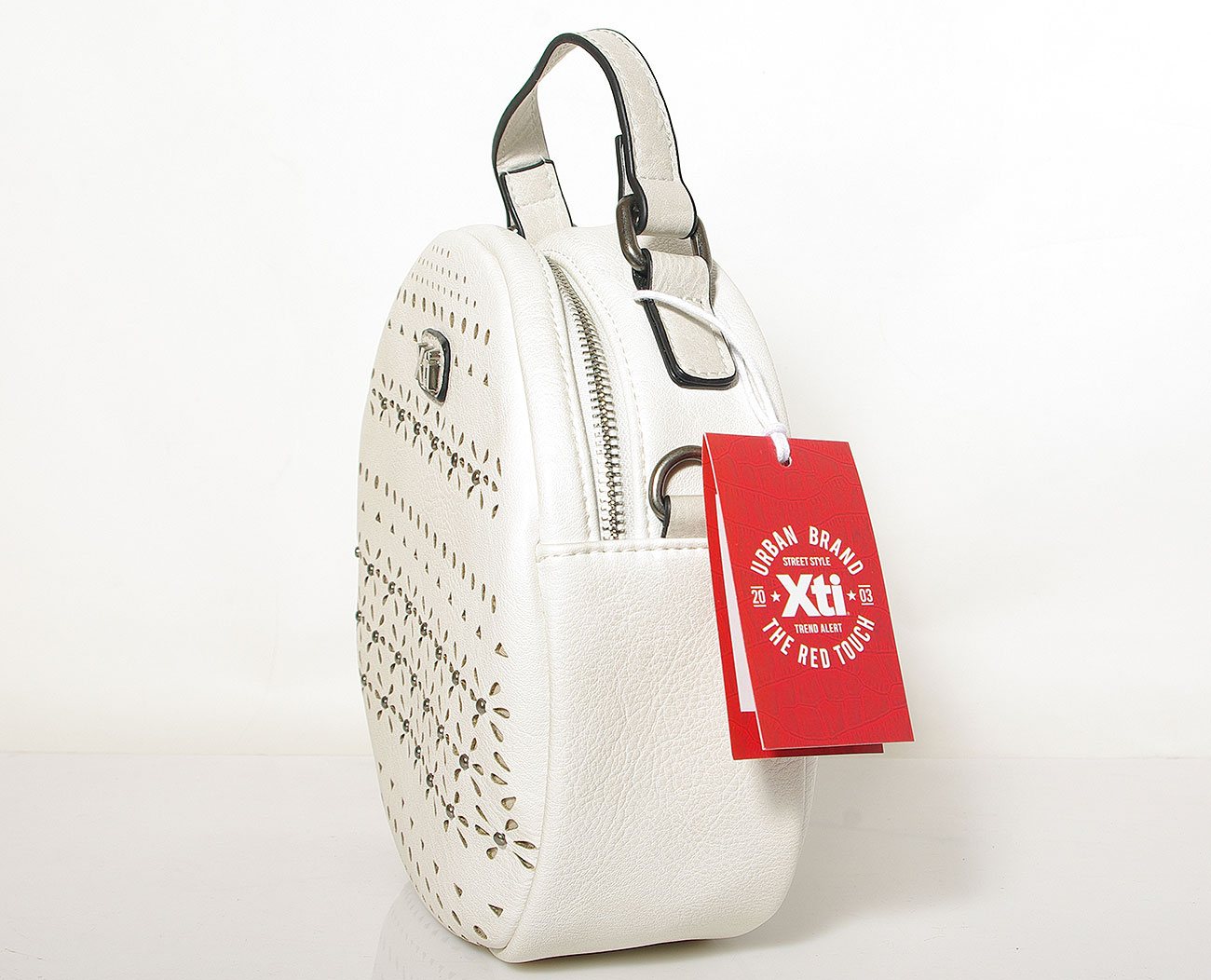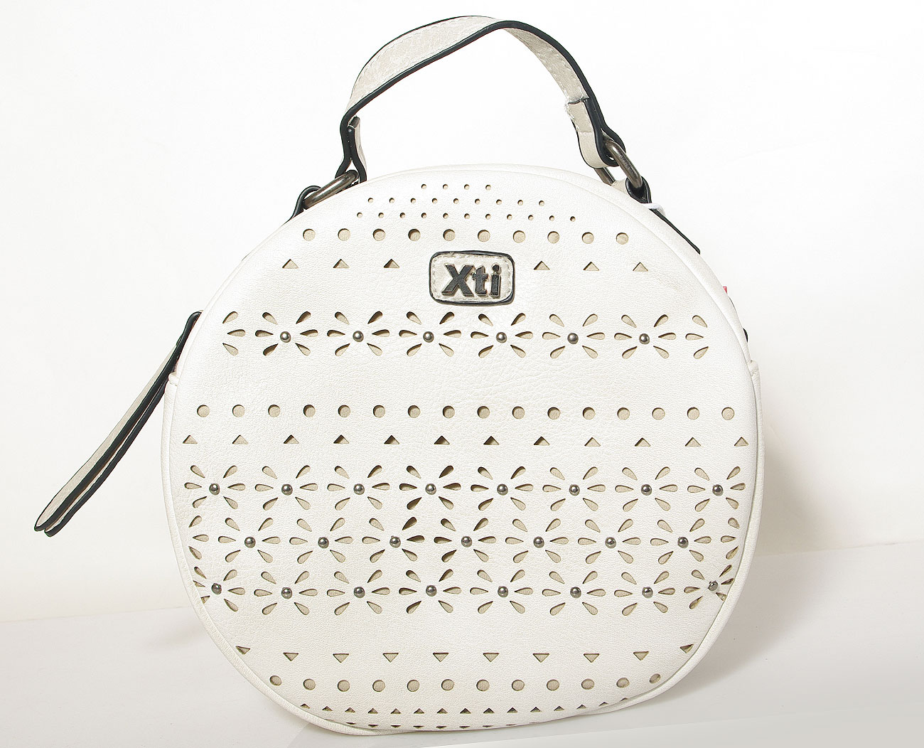 Nieduża, oryginalna torebka damska typu crossbody hiszpańskiej firmy Xti z eko skóry w kolorze ciepłej bieli. Na froncie zdobiona ażurową wycinanką i srebrnymi nitami. Kod produktu: 86430